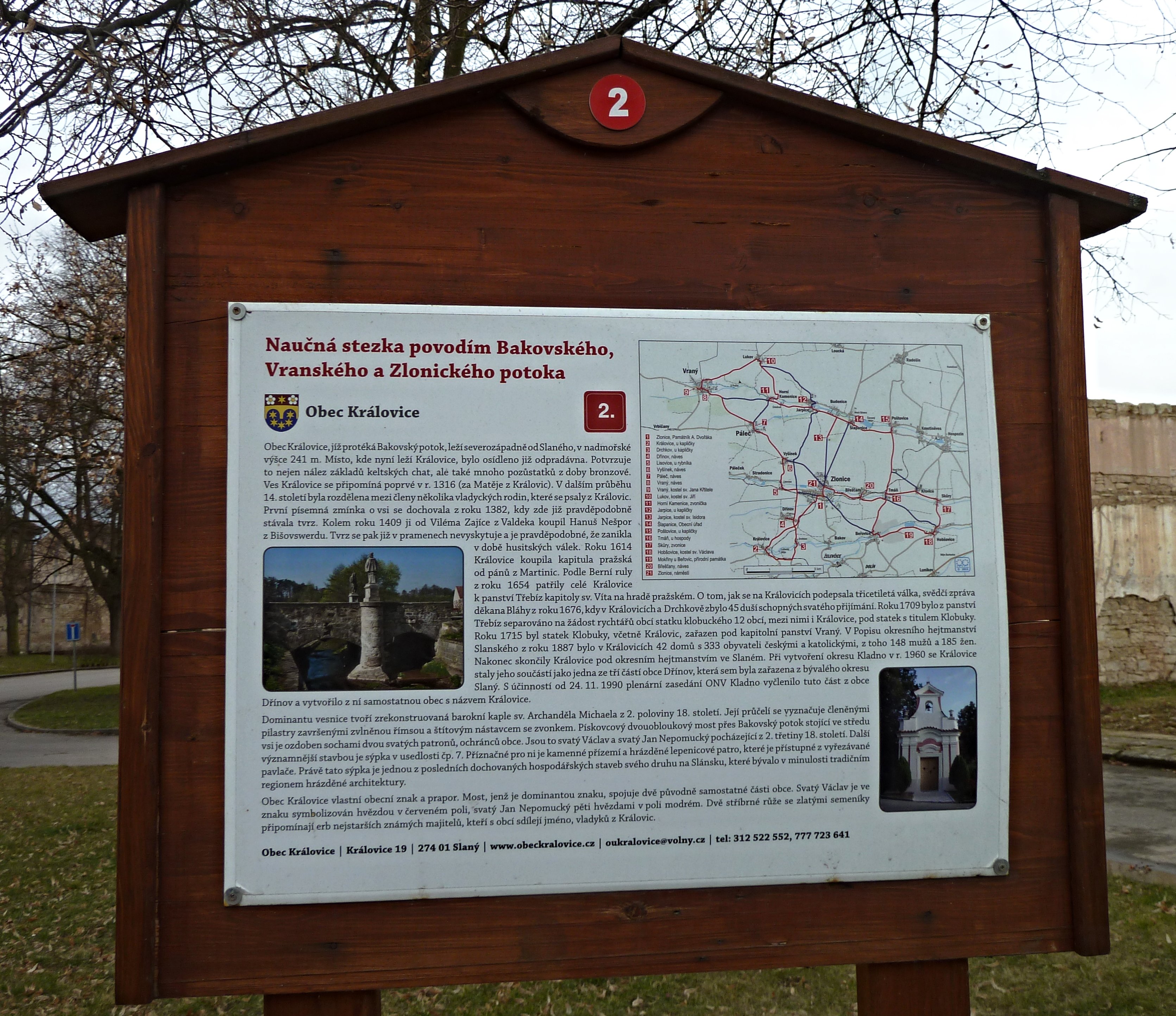 Obec na Bakovském potoce, 4 km severozápadně od Slaného. – Nadmořská výška: 241 m. – Území osídleno již v pravěku, o čemž svědčí hromadným nález zlomků bronzových předmětů z období knovízské kultury a odkrytí základů keltských obydlí. První písemná zmínka o obci z r. 1316, tehdy v držení místních vladyků (snad předků rodu Trčků z Královic). V l. 1404-1409 ves s tvrzí v majetku Viléma Zajíce z Valdeka. V 15. stol. opět v majetku drobných feudálů, mezi nimiž byl i slánský rychtář. V pol. 15. stol. jsou již bez tvrze, která zanikla v husitských válkách. V 16. stol. v držení Martiniců (při panství Telce), v r. 1614 Královice získala svatovítská kapitula a připojila je k Třebízi. Třicetiletá válka obec celkem nezasáhla, k r. 1654 zde zmiňováno 16 převážně selských usedlostí. R. 1715 Královice připojeny ke kapitulnímu panství Vraný, kde zůstaly až do r. 1850. – Z pamětihodností v obci pozdně barokní kaplička sv. Archanděla Michaela na návsi, dva mlýny - jeden s dochovaným mlýnským kolem, druhý zvaný Lužecký. Obě části obce spojuje kamenný dvouobloukový most, na středním pilíři starší barokní sochy sv. Václava a sv. Jana Nepomuckého ze druhé poloviny 18. stol. U usedlosti čp. 7 špýchar s hrázděnou konstrukcí z 18. stol. V obci také několik klasicistních stavení, boží muka a bývalá veřejná váha. Nad obcí zalesněný vrch Řipec (316 m n. m.), který za války sloužil jako střelnice wehrmachtu. Vysoký železniční most je z konce 19. stol. – K významným rodákům patří např. spisovatel Josef Hrdina, starosta města Slaný Josef Hlaváček ad. – Novodobě se zde pořádá Staročeská pouť spojená s historickou bitvou o královickou tvrz. Na katastru obce je Jezdecké centrum Kralovický dvůr, kde se pořádají mj. jezdecké závody. Od r. 2013 vede přes obec naučná stezka Povodím Bakovského, Vranského a Zlonického potoka.